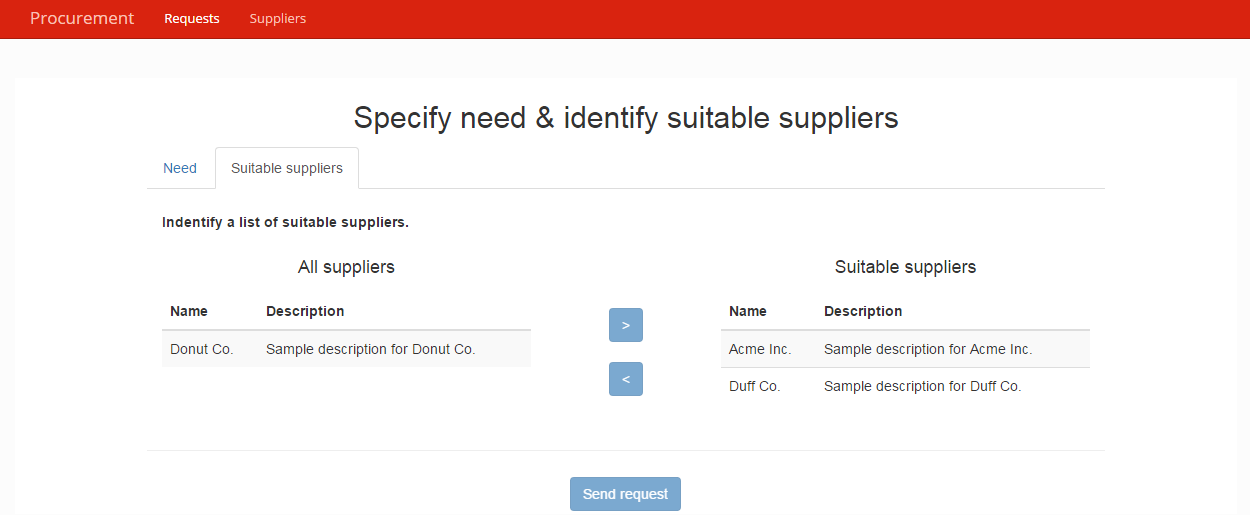 suppliersthat is used to create a list of suppliers. Suppliers to create are defined in the business variable default value. Executing this process will create the suppliers. :warning: This process should not be executed twice to avoid suppliers duplication (The process instantiation form includes a warning message if suppliers already exists). - Procurement request: This is the main process diagram. A user fill a procurement request and identify potential suppliers. This request is sent to those suppliers for quotation. After completed, the quotations are sent back to the requestor for review and selection.