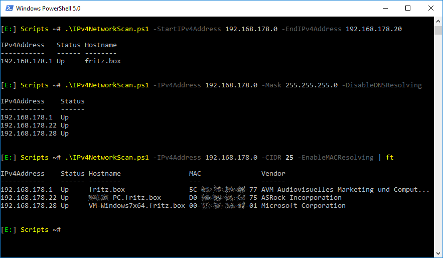 192.168.178.1 Up fritz.boxPS> .\IPv4NetworkScan.ps1 -IPv4Address 192.168.178.0 -Mask 255.255.255.0 -DisableDNSResolving