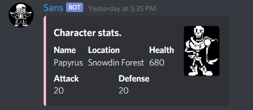 - A few commands such as !badtime and !check (Shows undertale characters' stats).