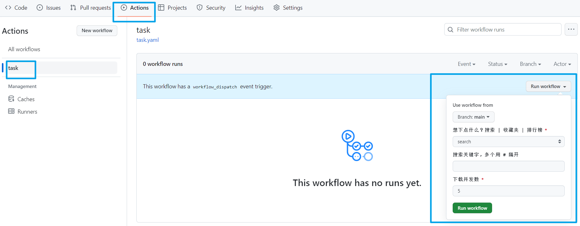 然后点击 Actions,再点击左侧的 task 工作流,再点击右侧的 Run workflow,输入相关的信息,点击运行。