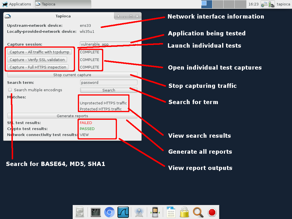 In "Verify SSL validation" mode, Tapioca will intercept web traffic, and the HTTPS communications between the client and Tapioca will use an invalid root CA certificate. Any client that allows HTTPS traffic through Tapioca without warning is vulnerable to malicious interception. Despite the client using HTTPS, it is not receiving the benefits that HTTPS aims to provide. This capture is required to allow the SSL test report to be generated.