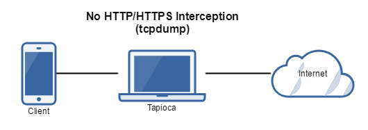 In "All traffic with tcpdump" mode, Tapioca doesn't interfere with HTTPS negotiation. This allows Tapioca to inspect the HTTPS handshakes that occur between a client and a server. If a client is using insecure crypto, or protocols other than HTTP/HTTPS, then the tcpdump capture will be required to detect this. This capture is required to allow the Crypto test report to be generated.