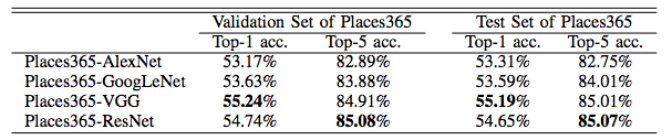 As comparison, we list the performance of the baseline CNNs trained on Places205 as below. There are 160 more scene categories in Places365 than the Places205, the top-5 accuracy doesn't drop much.