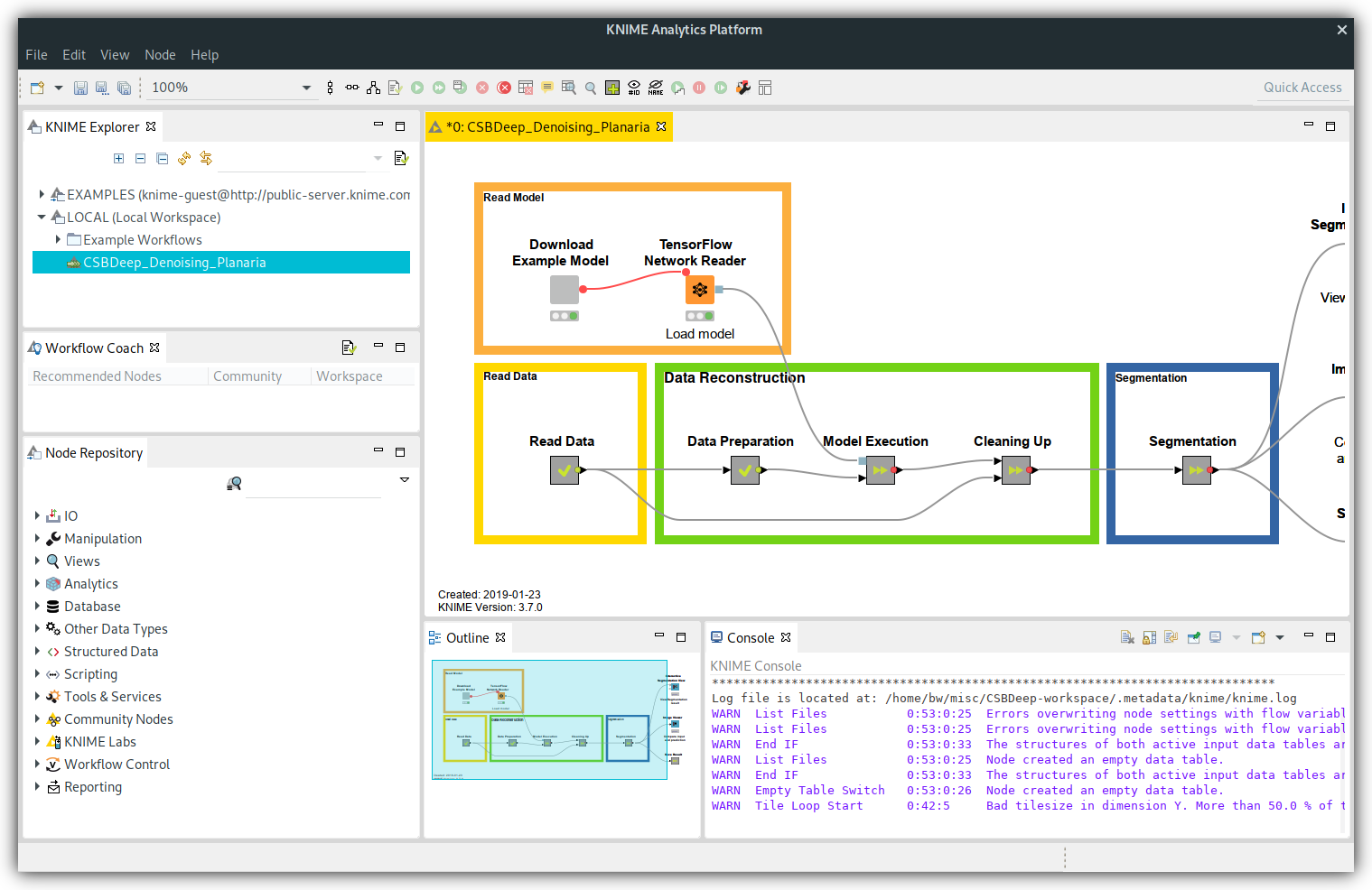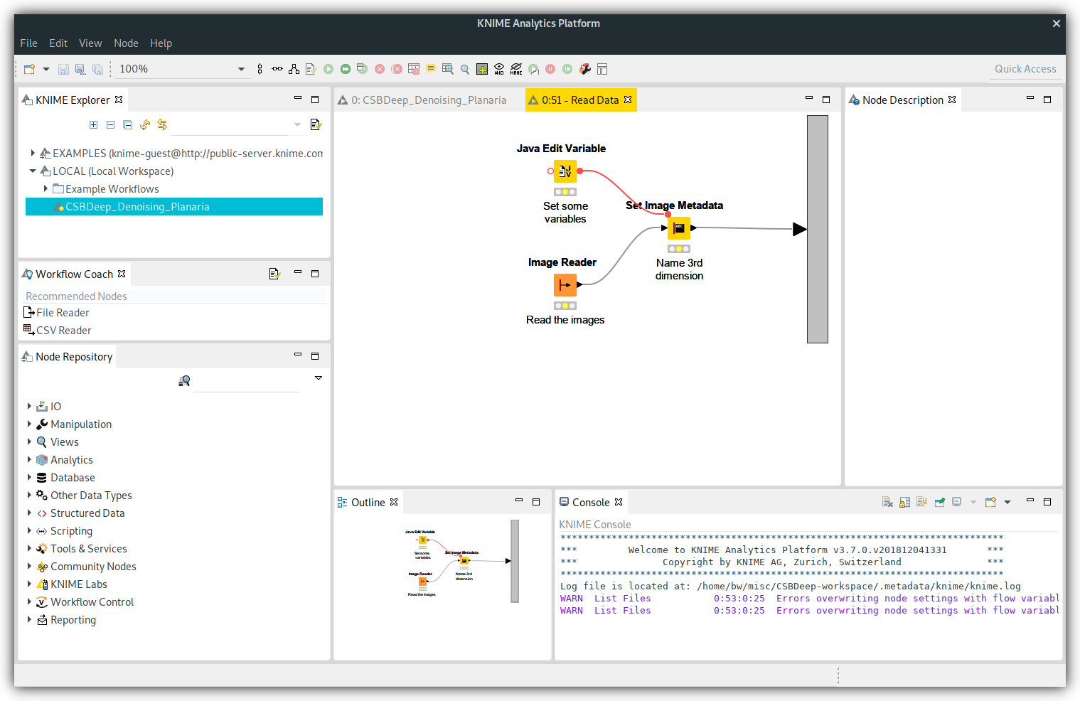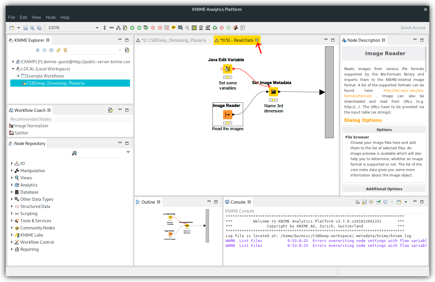The "CSBDeep_Denoising_Planaria" workflow should now be in you KNIME Explorer. Double click on it to open it.