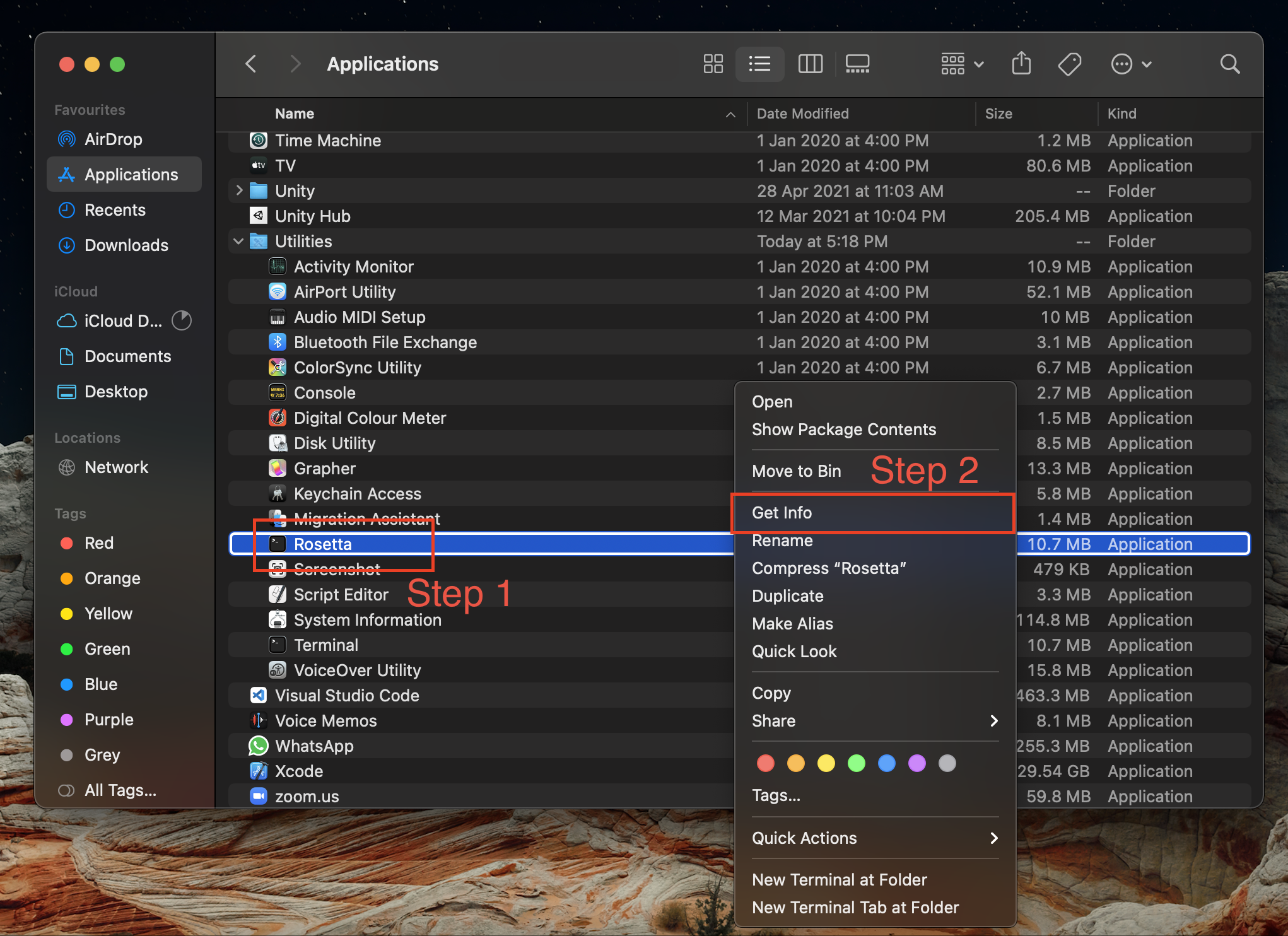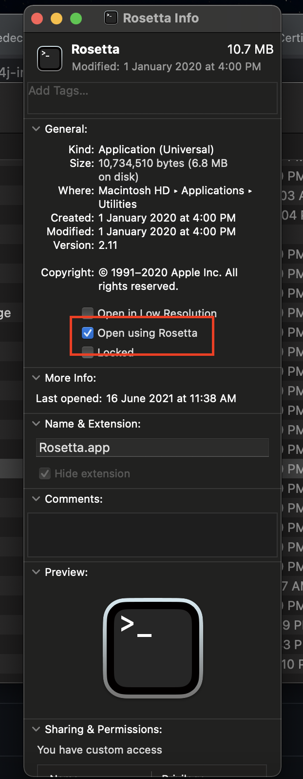 Make sure Open using Rosetta is checked to enable the Rosetta environment.