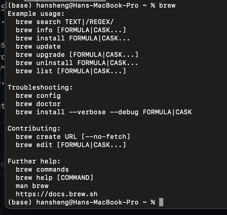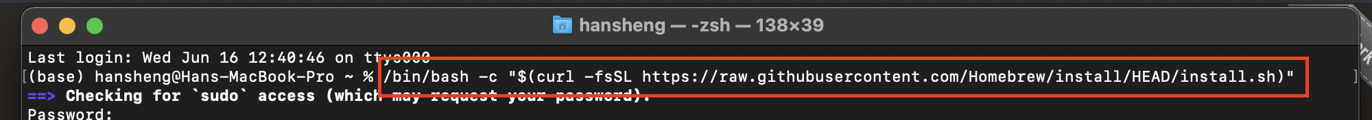 /bin/bash -c "$(curl -fsSL https://raw.githubusercontent.com/Homebrew/install/HEAD/install.sh)". Ignore the(base)in the screenshot.