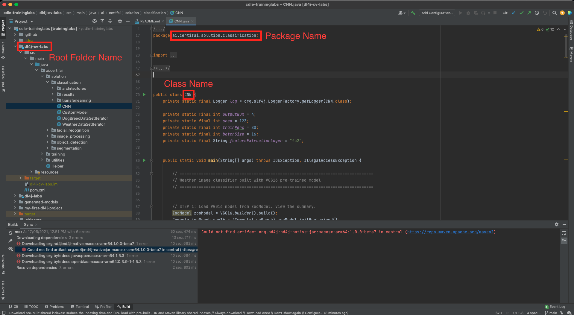 We need to identify its root folder name, package name and class name for the Java file we want to compile. Let's say we want to run CNN.java in dl4j-cv-labs.