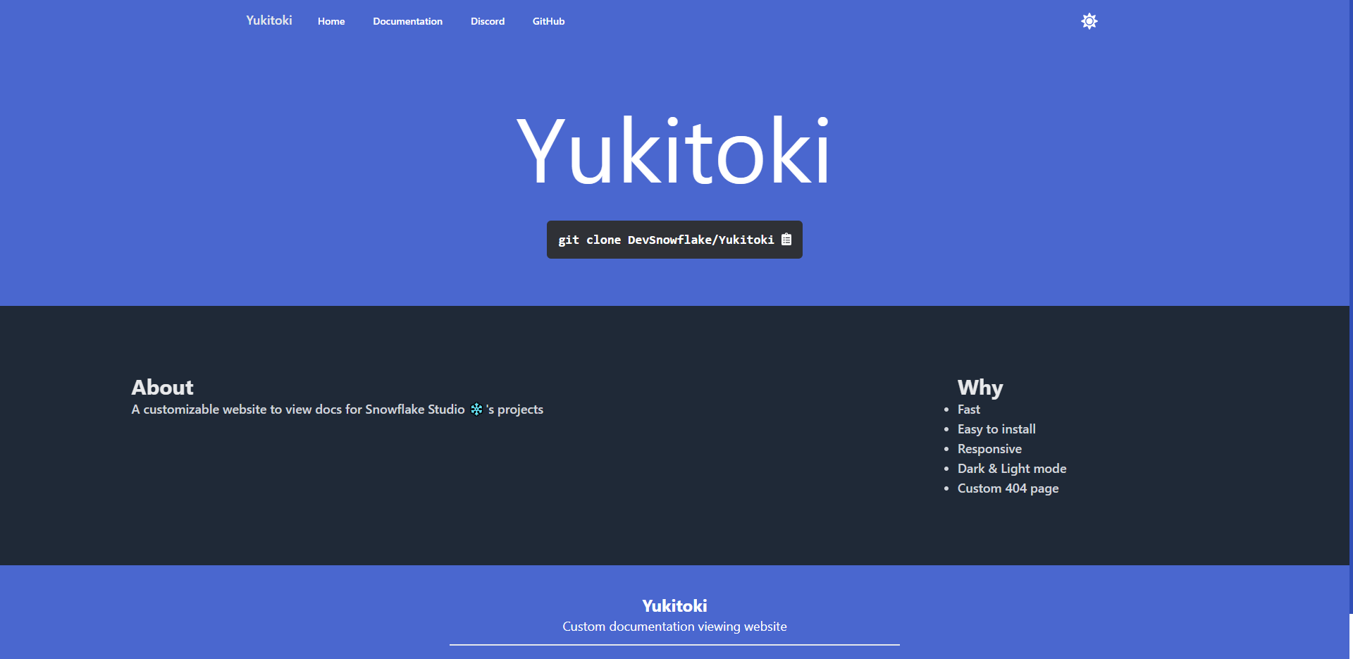 Yukitoki A customizable website to view docs for Snowflake Studio ❄'s projects. Built with svelte tailwindcss Features Responsive Light & Dark mode Custom 404 page Easy to setup Live Preview https://yukitoki.netlify.app Preview