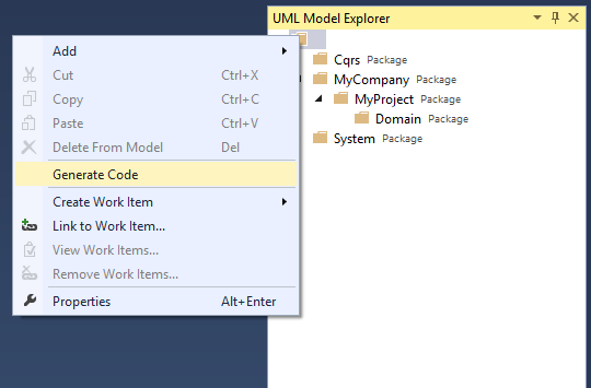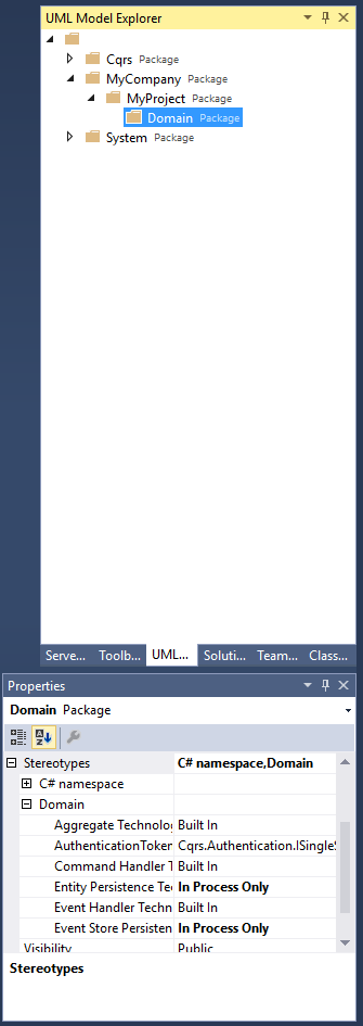 Locate the UML Model Explorer. Here you will see three nodes, Cqrs, MyCompany and System. Cqrs and System are models mapping to .net framework requirements and the core Cqrs package requirements. Inside the MyCompany node you will find a MyProject node. At this point you should be able to visualise how these match to recommended conventions for namespacing your code. Changing the names of these node will change the namespaces of all the generated code.