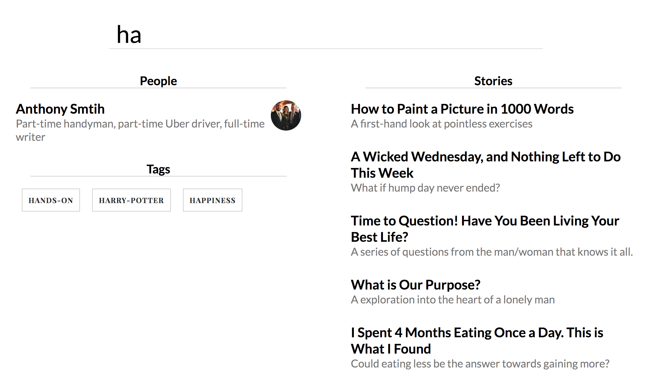 Stories, authors, and tags can be searched for simultaneously using the search view, accessible via the search icon in the header. The search feature leverages regular expressions to filter through content that makes the current user's query.