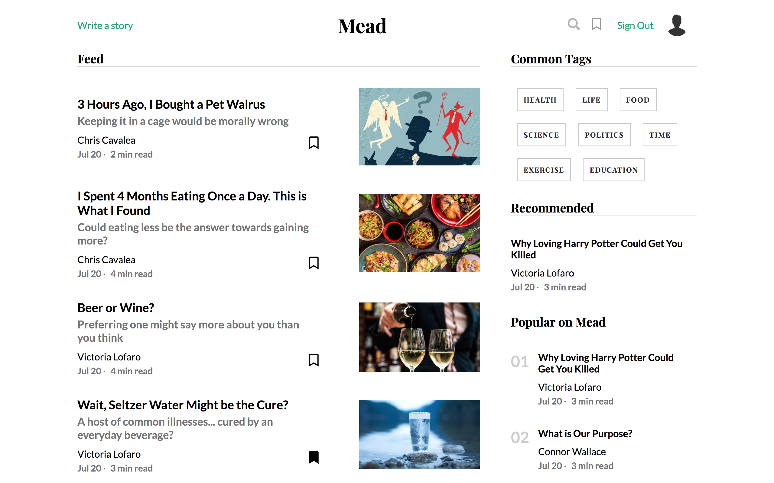 Mead is a full-stack, single-page application built with React.js and Ruby on Rails. Mead mirrors the familiar social blogging platform Medium.