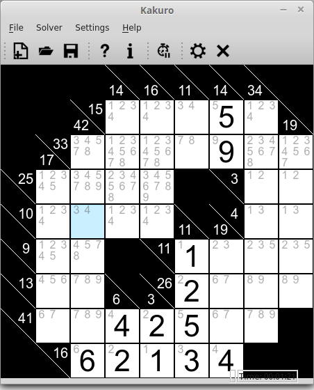 This is an application designed for Kakuro puzzles. Kakuro is a Japanese puzzle game that is similar to Sudoku. It is sometimes called a mathematical version of the crossword puzzle. The goal is to fill in each entry with some combination of digits 1-9 (inclusive, with no duplicate digits allowed) so that the sum of each group is equal to the 'clue' associated with the group.