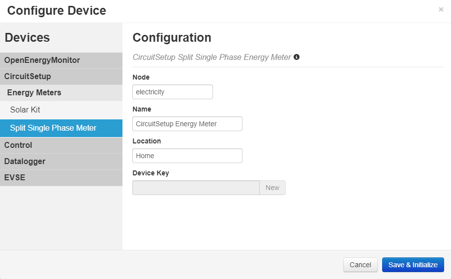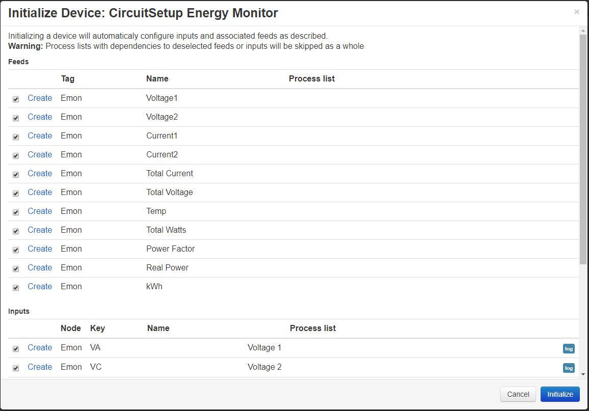 For all but the EmonCMS.org service, (currently for EmonCMS.org these feeds and inputs have to be setup manually) you can automatically setup the energy meter device in EmonCMS: