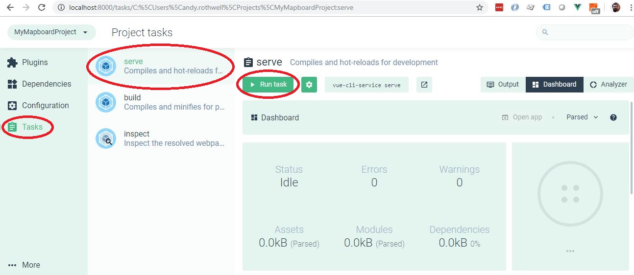 On the left, click on "Tasks." In the middle column, click "serve." To the right, click "Run task":