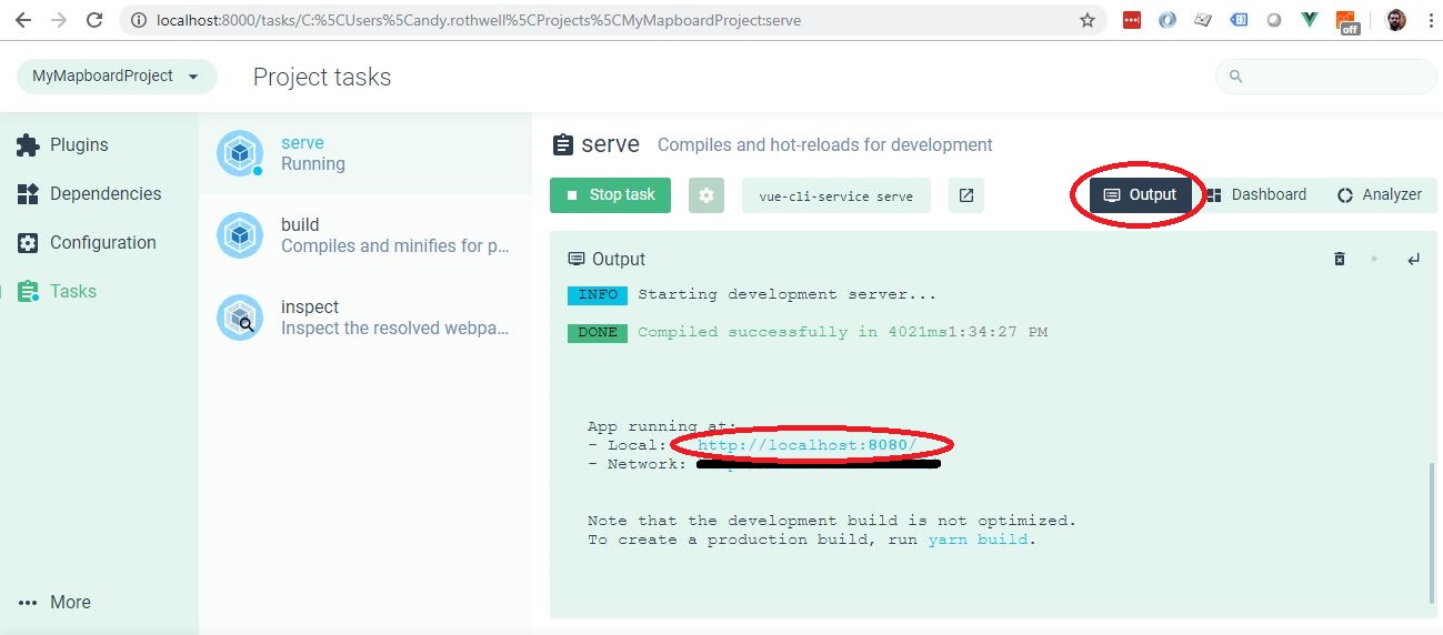 Click on the "Output" tab to see instructions on how to visit the app that it built and is serving: