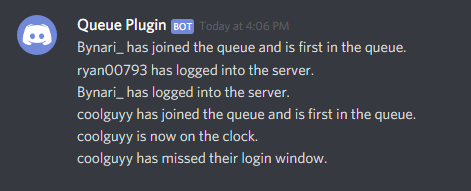 LQDiscordBot A discord webhook bot plugin that goes with the civex login queue plugin. Step 1) Create a channel webhook put the url in the config Step 2) Turn on messages that you want. Login Queue it self https://github.com/CivilizatonExperiment/LoginSystem