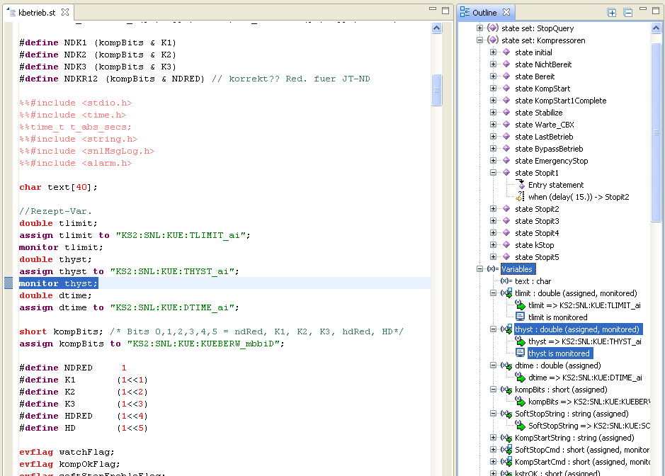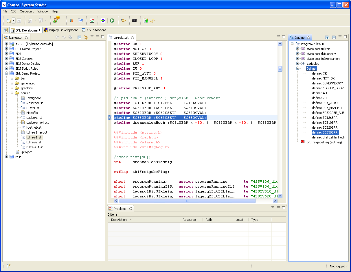 The State Notation Language is a superset of the C language, used for programming EPICS-based IOCs. The SNL perspective aids in editing through syntax highlighting, display of problems, code completion and outline-based navigation in the source code.
