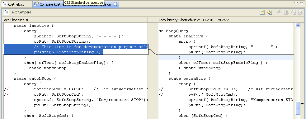 Even though you are not connected to a source code repository, a limited amount of version management is available. Each time you save a file it is stored in the local history maintained by CSS. This is by no means a replacement for backup nor for a repository, just a hint for working in CSS.