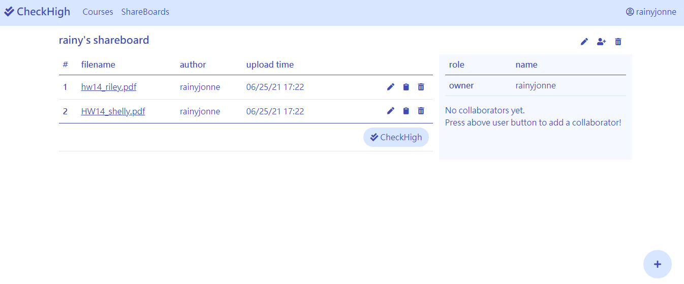 - If you own the shareboard, you can send invitation link to those who haven't registered CheckHigh yet but you want to share your assignments with. If your friends have registered CheckHigh, you can invite them by simply typing their email after clicking the add collaborator button. You can also removed collaborators from the shareboard, and their assignments will be removed as well when you removed them from the shareboard.