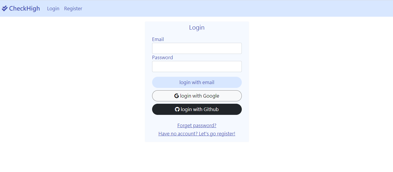 - You should use your github account, google account to login in, or register an account for CheckHigh and login in.