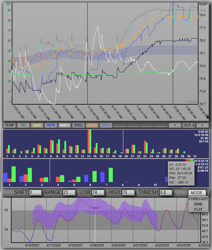 The web chart. Dark gray is off, cyan is fan running, blue is compressor+fan, NG is red, HP is yellow, rh is green, the target/threshold is the wave. The thermostat is in the hottest room in the house, so it does look warmer than it really is, but that's why there's a remote unit, and now multiple sensors.
