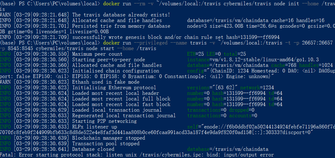 There`s a problem when I run : docker run --privileged --name travis -v ~/volumes/local:/travis -t -p 26657:26657 -p 8545:8545 cybermiles/travis node start --home /travis