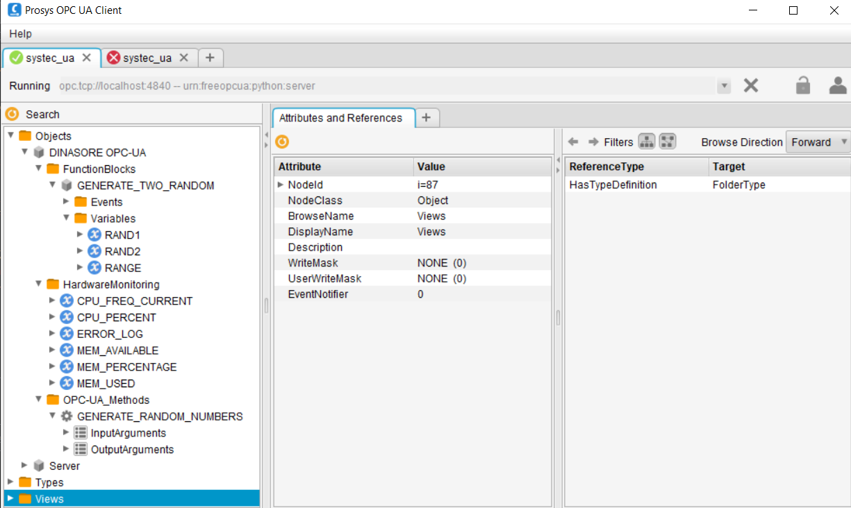 The DINASORE enables the OPC-UA integration with external platforms, for the monitoring of the FBs work, in both variables and events. The structure of the OPC-UA server follows the same organization of the XML data model file. The Prosys OPC-UA client (download here) is one of the tools available to monitor the DINASORE OPC-UA server, enabling the monitorization of any FB variable, and the navigation through the OPC-UA server objects.