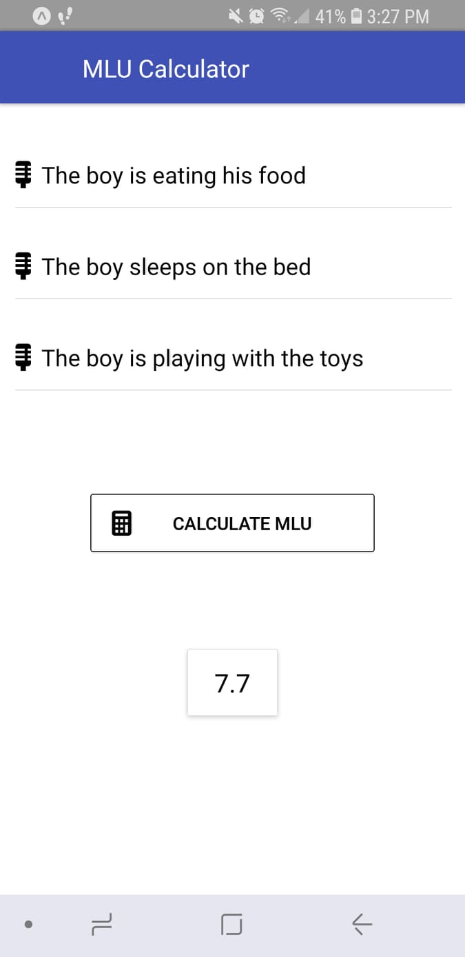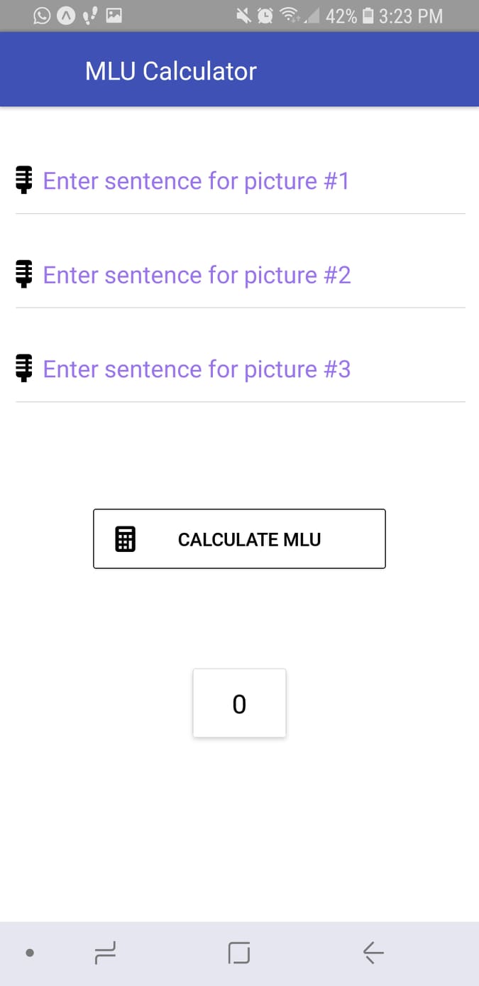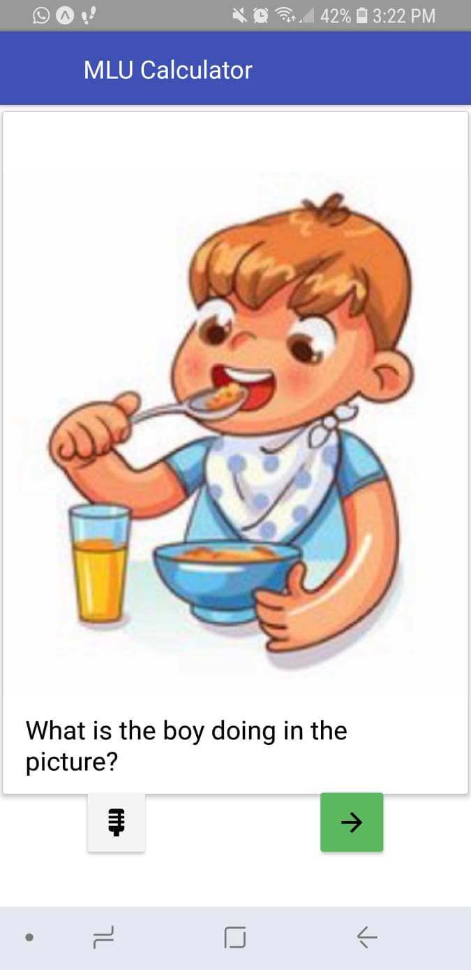 Demo App for calculating mean length of utterance. A picture is shown where the user will record what is occurring and after the MLU will be calculated. This app was made for Special Education course in university.