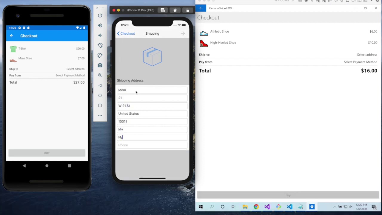 The video shows using Stripe's API from a Xamarin app that runs on iOS, Android and Windows, with all the code, including the UI code being shared across all three platforms.