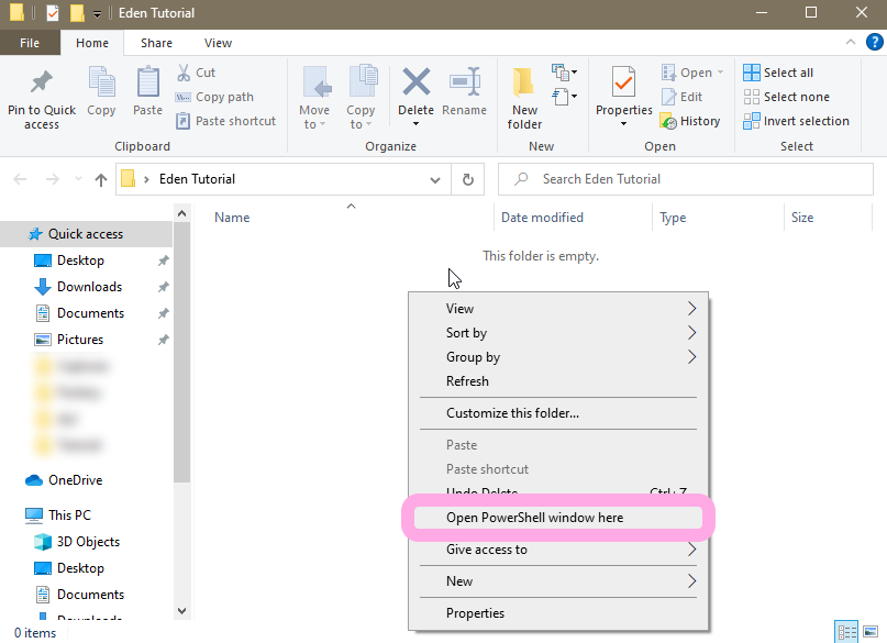 Do shift + right click and select open powershell (or cmd depending on your PC)