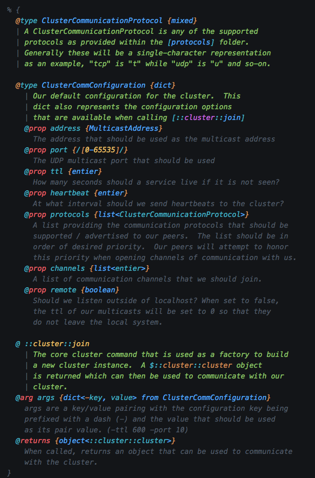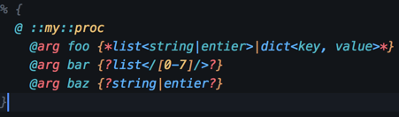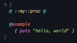 % { $::my::variable }When a line starts with an opening curly bracket, it will be given standard syntax highlighting. This can be useful when providing examples of calling a proc, etc. These can span multiple lines.