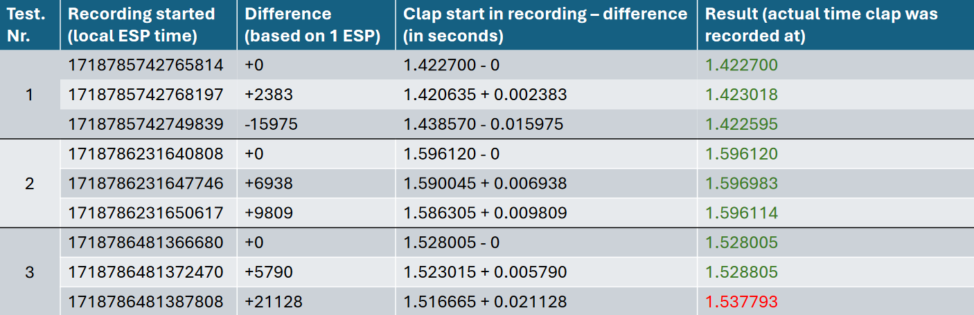 - Time synchronization between the ESP32s needs to be improved (or removed altogether, by setting a predetermined offset for sending packets). Current time sync (checked manually through Audacity by clapping and looking at the waveforms):