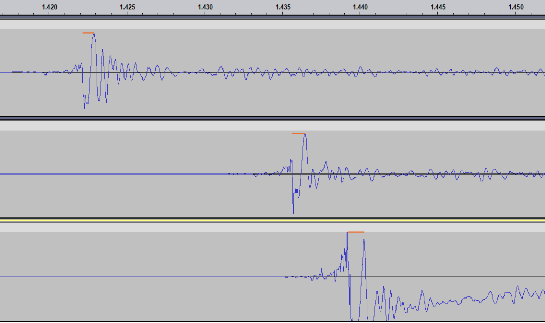 - Find a better solution for/than finding the highest amplitude in a specific time frame for the TDOA calculations (as noted before, this automatic approach provides seemingly worse results on average than just recording the audio data from the ESP32s and looking at the waveforms to determine how synchronized the ESP32s are). This can be due to the microphones producing different audio data, as such the peaks can be in the "wrong place":