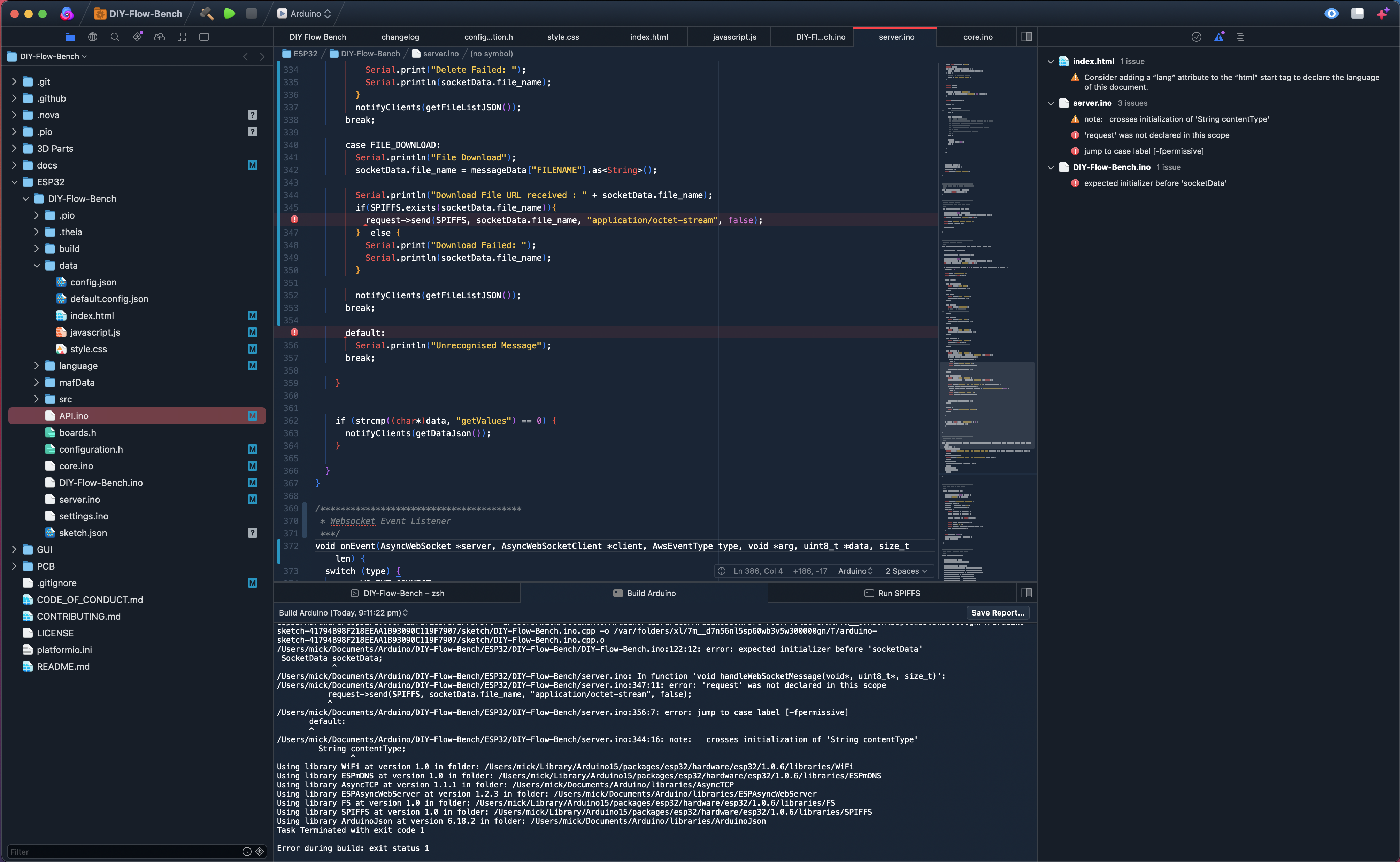 Not only does this keep everything within Nova but it also provides compile errors within the sidebar that link to the code, which is also highlighted at the line where the error is. This is really useful and a feature that I requested in the Arduino Pro IDE beta.