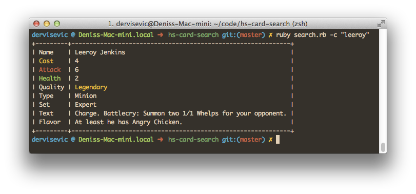 It already supports autocompletion with tab when the application is running. So ed and tab will become "edwin van cleef". The tab completion will show all 400+ cards. These have been downloaded and stored in the repo for fast access. You can now also search directly via the command line with the -c or --card argument. The script now supports partial search as well, so "doom" will find Doomhammer, Doomguard, Bane of Doom and Doomsayer.