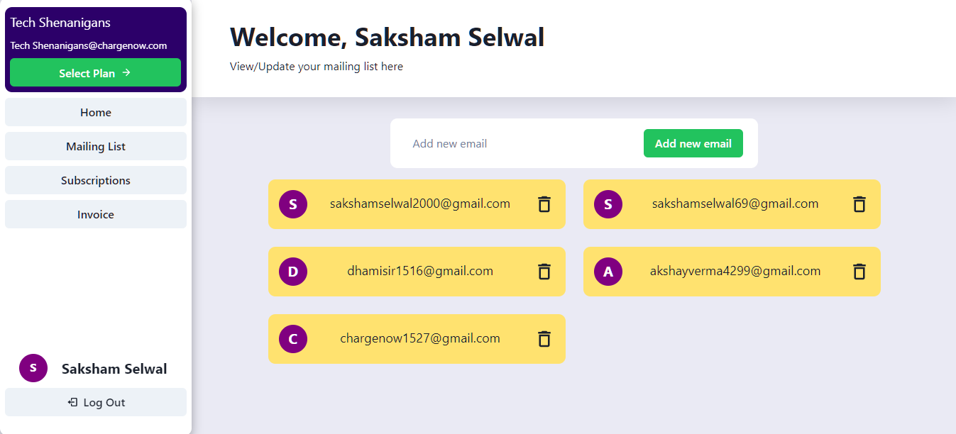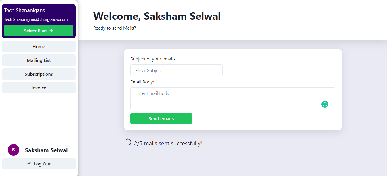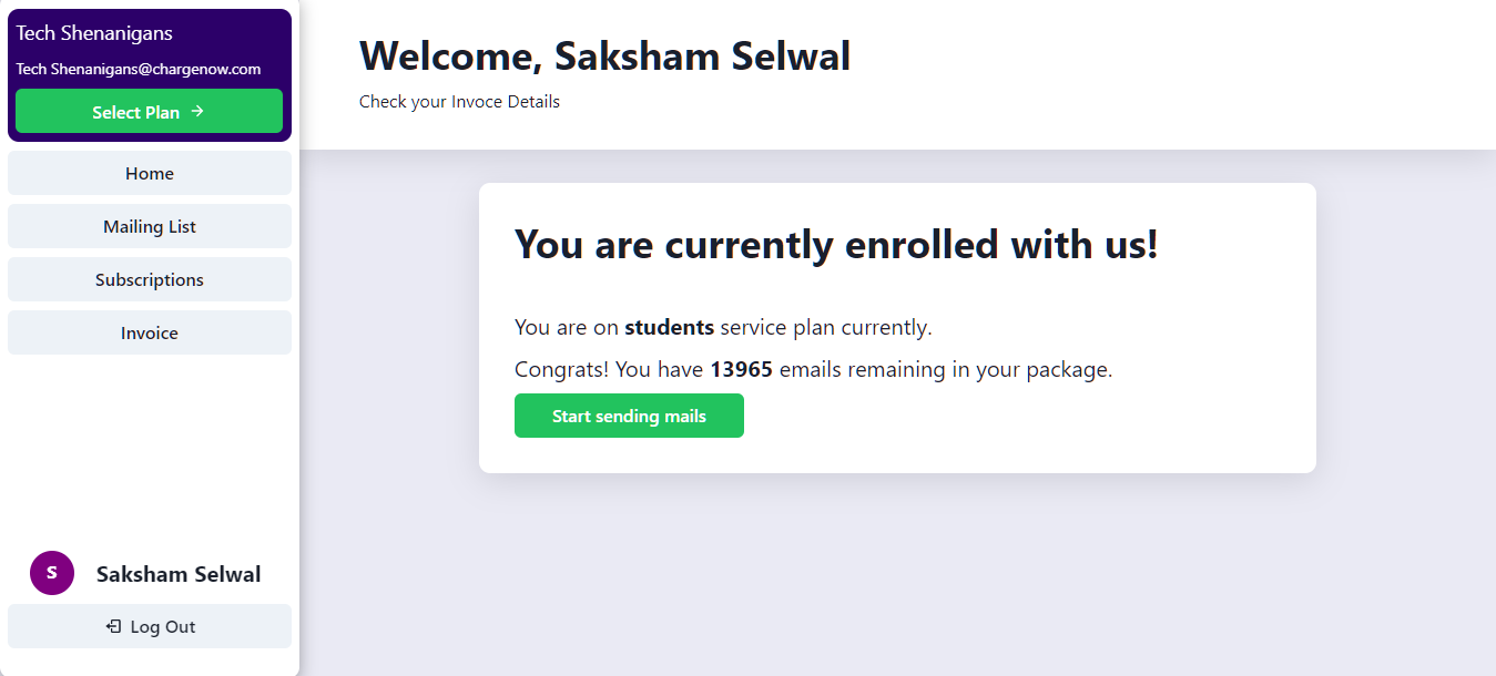 Charge Now is a bulk mailing web service where user can create a mailing list and send mails to all all of those emails with just one click, with realtime status for mails sent. This project also has admin access where the admin can add or remove service plans that the users can buy.