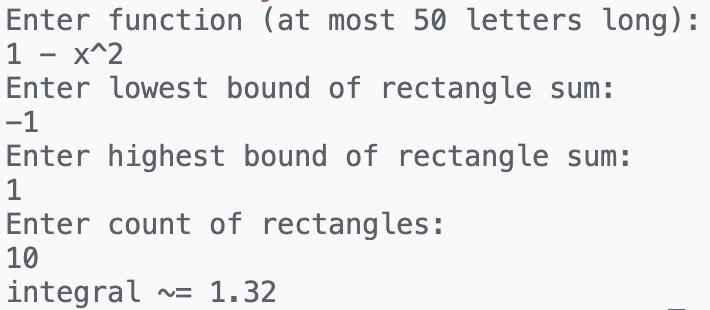 README Brief: A MPI C++ project for doing numeric integral approximation with the rectangle rule, but with a twist: For a range of user-entered functions! Requirements: Git CMake 3.16+ A C++ MPI compiler e.g mpicxx, etc. The mpi.h AKA the MPI library header. Sample Output: Check by Desmos Result: