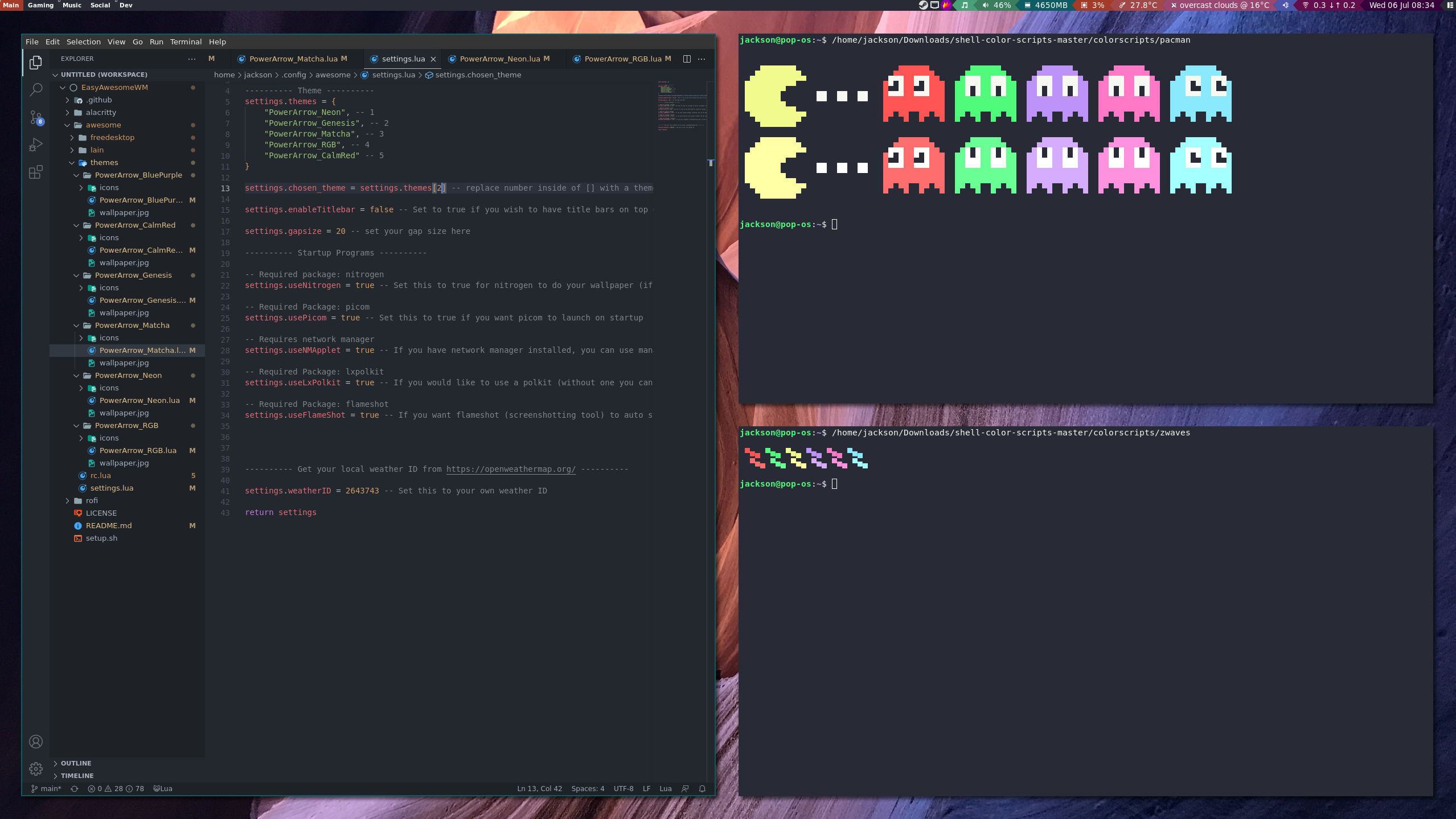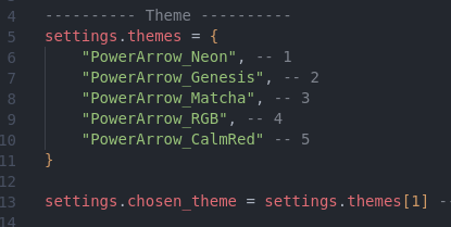 If you want to select a certain theme you can just edit the number inside the brackets "settings.theme[number_here]" In the following image, theme number 1 is selected. Then restart awesome by pressing "super + R"