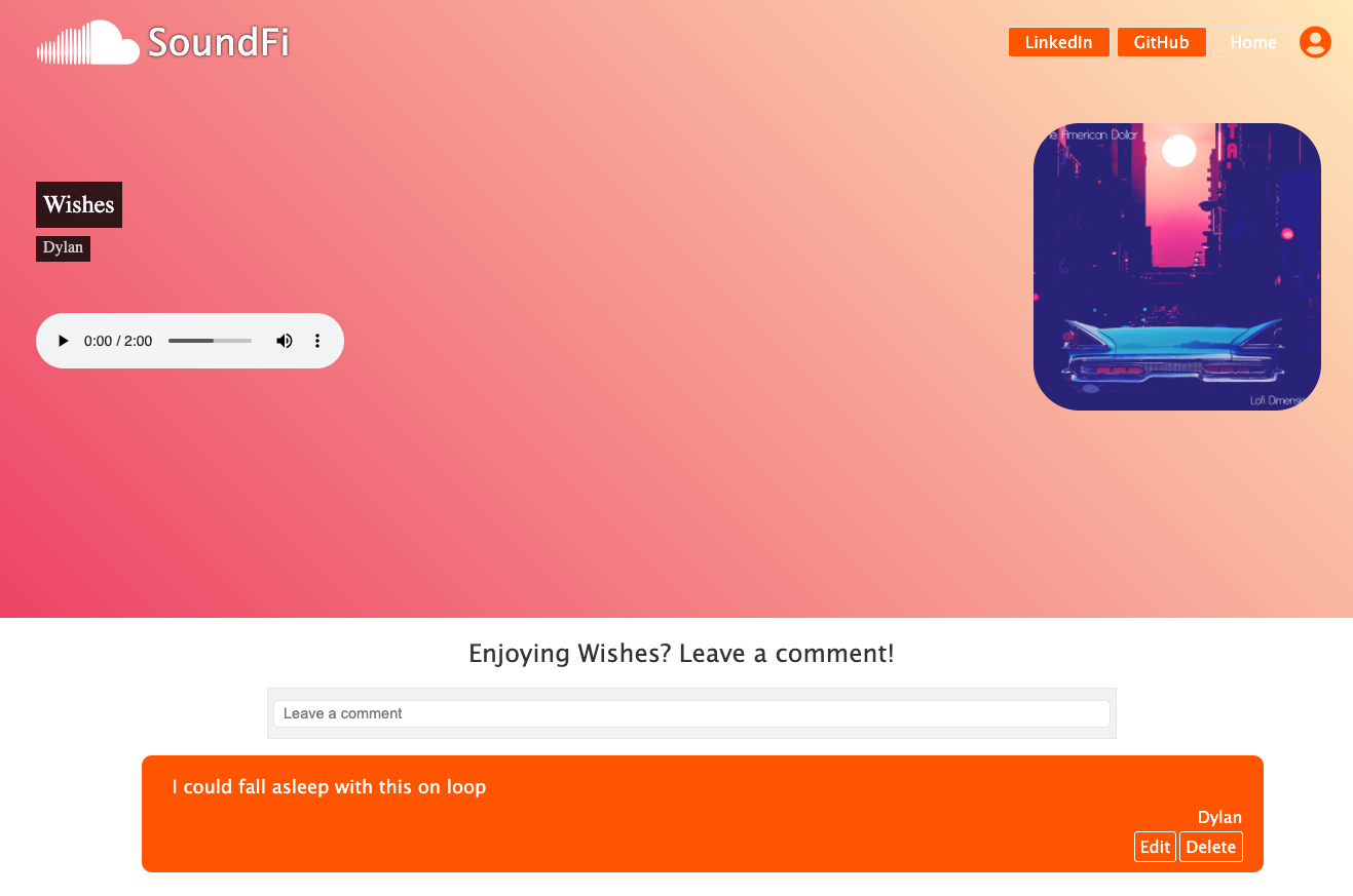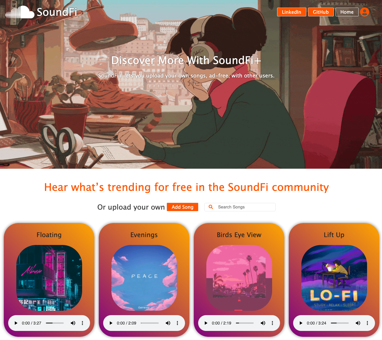 Sound Fi is a web application inspired by my time learning at App Academy. Lofi music was a huge help in making it through the 60+ hour weeks and I wanted to build something related to that. Sound Fi is a soundcloud clone with my own design that uses file upload with cloudinary's API and plays audio with React Audio Player.