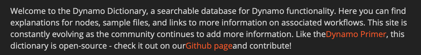 | <a href="https://github.com/DynamoDS/DynamoDictionary" target="_blank" rel="noopener noreferrer" style={{'color':'orangered'}} >Github page</a> | ||