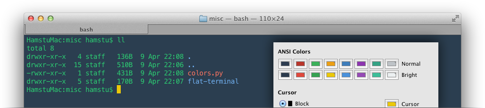 flat-terminal Flat design colours applied to terminal. Terminal is now sweeter than ever! Available for Terminal and iTerm. Dribbble link: http://dribbble.com/shots/1021755-Flat-Terminal-Theme