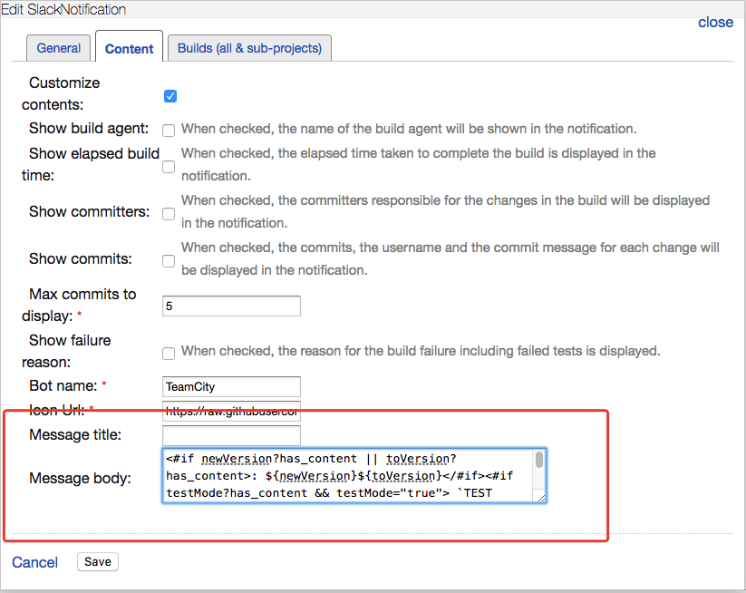 This is fork of https://github.com/PeteGoo/tcSlackBuildNotifier, with ability to customize message with freemarker templates, including any build parameters into the message.
