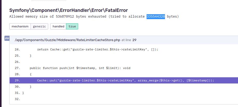 Old example for laravel leads to out of memory php fatal errors - because it doesn't limit the number of stored items and at the same time doesn't have ttl, so cache is remembered forever.
