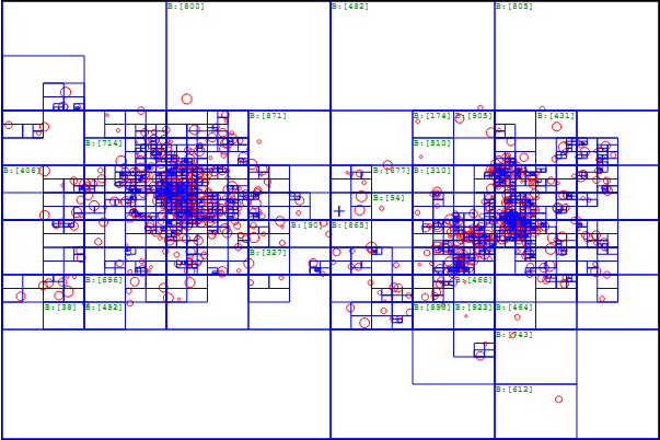 A Barnes-Hut Tree sub-divides the space by quadrants, providing a large speed-up by approximating particle interactions at long distances: