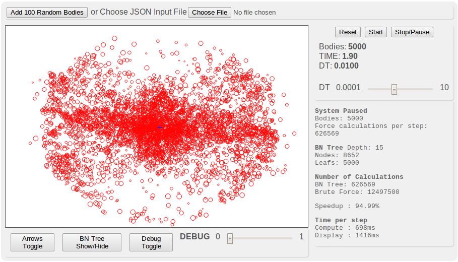 With 10k bodies it takes around 0.5~0.8 seconds to compute a step, and 0.1-0.3 seconds to display it on the canvas.