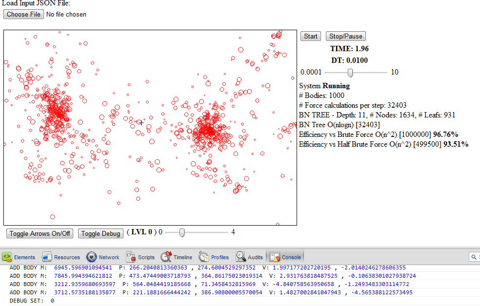 Barnes-Hut calculation implemented and working. Real-time for N > 1k etc.