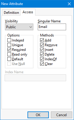 For every persistent attribute a corresponding property is added to the class. The value of the attribute is accessed through this property. The Visibility entry sets the class visibility scope of this property. The Options check box group offers options for simple attribute properties to be indexed (in its table), required or readonly. The Default option relates to containerattributes. It specifies whether this attribute is the default container attribute for its class. The Methods check box group relate to containerattributes. Methods can be selected to manipulate the content of the attribute. The selected methods will be created with the same visibility scope as the property. The Singular Name entry will be used when creating these methods. The Attribute Editor offers a default singular name derived from the attribute Name entered on the Definition page, however this might not always be appropriate and in these cases the entry can be edited. In addition to the array property created to access objects contained in these attributes, a count property reflecting the number of objects in the container will also be added.