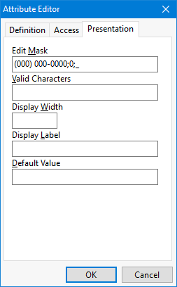 For some of the simple attribute types, settings regarding the presentation of the attribute can be specified on the last page of the Attribute Editor. An edit mask to be used when editing the value of the attribute can be specified in Mask. The characters that are accepted during input when editing the attribute value can be specified in Valid Characters. Display Width can be used to set the default display width to be used when editing the value of the attribute. The properties are used by the InstantObjects user interfacecomponents.