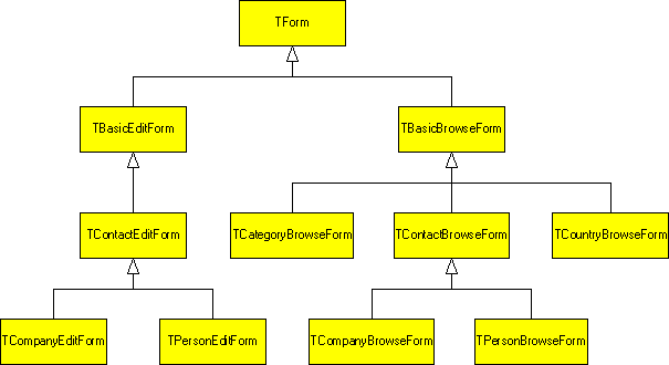 The user interface of the contact book relies on visual form inheritance. The following diagram shows the form class hierarchy.