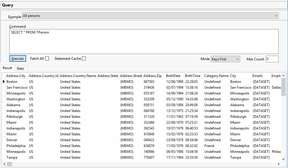The above command will select all objects of the TPerson class. By adding a WHERE clause and an ORDER BY clause, the selection is limited to objects meeting a certain criteria and sorted as well: